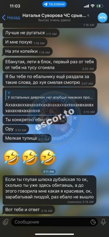 Дальше — лучше. Ей пишут: «Такое поведение неприемлемо, жду объяснений». Без оскорблений, по факту. В ответ — поток сознания пьяной мартышки. Решили подождать, пока протрезвеет. Но утром выяснилось: трезвая Наталья Суворова ещё страшнее.