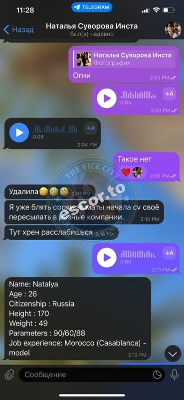 Дополнительный бонус: кроме занятий проституцией Наталья Суворова известна в узких кругах как «работница» консумации в Марокко. Видимо, там клиенты не так привередливы к адекватности.